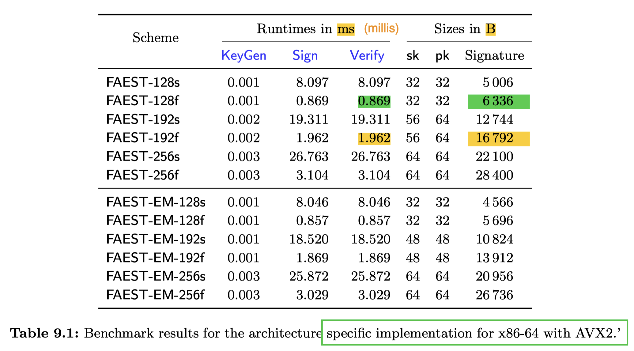 | Scheme | Signing Time | Verification Time | Sig. size (bytes) |